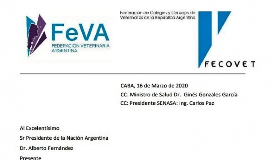 La Federación de Colegios y Consejos de Veterinarios de la República Argentina y la Federación Veterinaria Argentina han elevado una carta al Presidente de la Nación Argentina, Dr. Alberto Fernández, para recordarle que los Veterinarios son agentes primarios de salud.