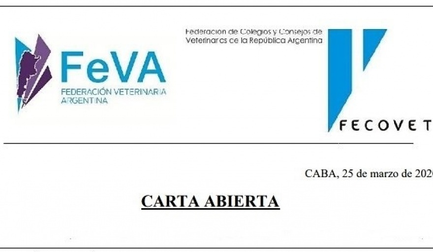 La Federación de Colegios y Consejos Veterinarios de la República Argentina y la Federación Veterinaria Argentina se han manifestado mediante una Carta Abierta acerca de la situación sanitaria que vive el país y el mundo ante la pandemia del COVID-19 y el rol de los Médicos Veterinarios.
