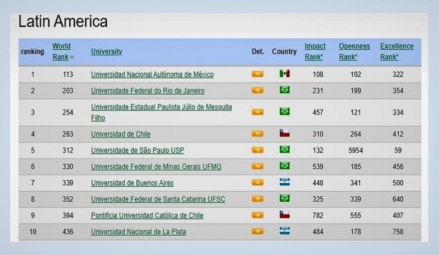 En la reciente edición de enero de 2021 del "Ranking Webometrics of World Universities" la Universidad de Buenos Aires y la Universidad Nacional de La Plata están ubicadas entre las 10 mejores universidades de América Latina.