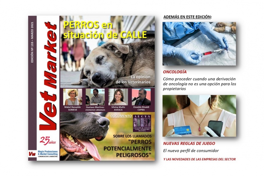 En esta edición de la revista Vet Market N° 133, se destaca el informe sobre los Perros en Situación de Calle con las opiniones de las instituciones veterinarias y el Documento de AECVA sobre los llamados Perros Potencialmente Peligrosos. También los artículos sobre Oncología y sobre El Nuevo Perfil de Consumidor. Además las novedades de las empresas del sector.