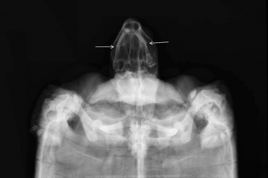Se establece terapia analgésica (Dexametasona 1mg/kg, tramadol 5mg/kg, y continua con meloxicam 0,2mg/kg y tramadol cada 24hs) y antibiótica (gentamicina 3mg/kg c/48hs) y se solicitan radiografías de cráneo.