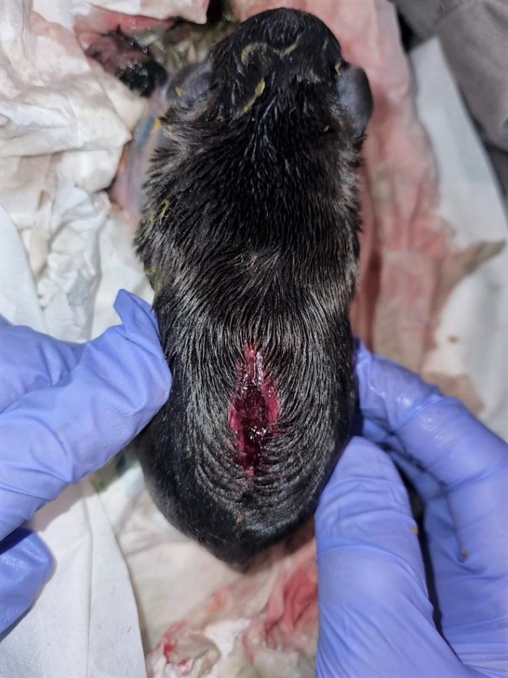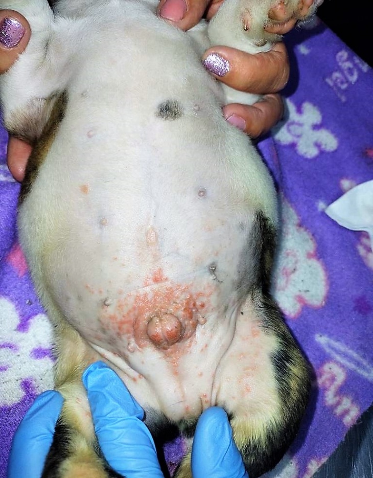 Se presenta a consulta un cachorro de BDI (Bulldog inglés) nacido por cesárea en julio de 2021. Algo muy frecuente entre los cachorros de una camada, es que confundan la vulva o el orificio prepucial de sus hermanos con el pezón de la madre y succionen pretendiendo mamar. Como antecedente, este cachorro en particular, sufrió un proceso inflamatorio/infeccioso alrededor del orificio prepucial externo que en su momento dificultó la micción y se medicó exitosamente con antibióticos y antiinflamatorios.