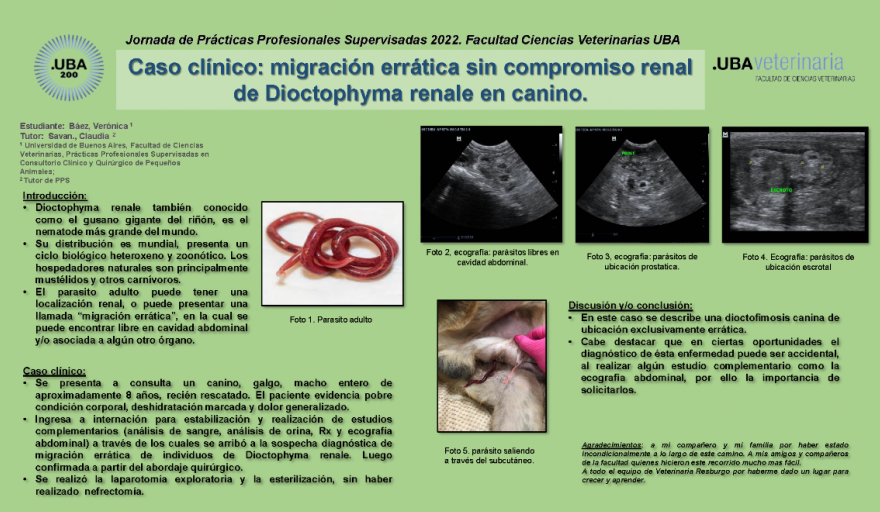 En esta oportunidad presentamos: "Caso Clínico: migración errática sin compromiso renal de Dioctophyma renale en canino" de la alumna Verónica Micaela Báez y tutoría de Claudia Savan.