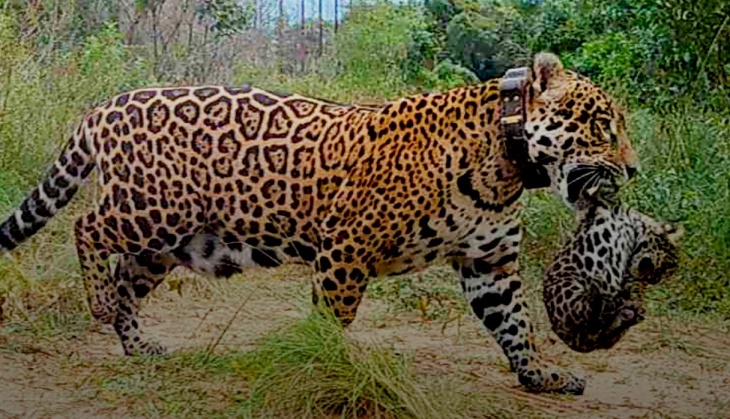 En las últimas semanas, el equipo técnico de Fundación Rewilding Argentina detectó que los movimientos de Arami se concentraron durante varias semanas en un mismo lugar: “Los puntos que emite el collar de Arami y que recibimos cada día a través de una conexión satelital sugerían que podría haber tenido cachorros ya que pasaba todo el tiempo en un mismo lugar, seguramente cuidando de ellos” dijo Magalí Longo, una de las coordinadoras del proyecto de reintroducción. Fue gracias a las imágenes de una cámara trampa que finalmente pudo confirmarse la buena noticia: en dos videos consecutivos, Arami aparece llevando a los cachorros en su boca.