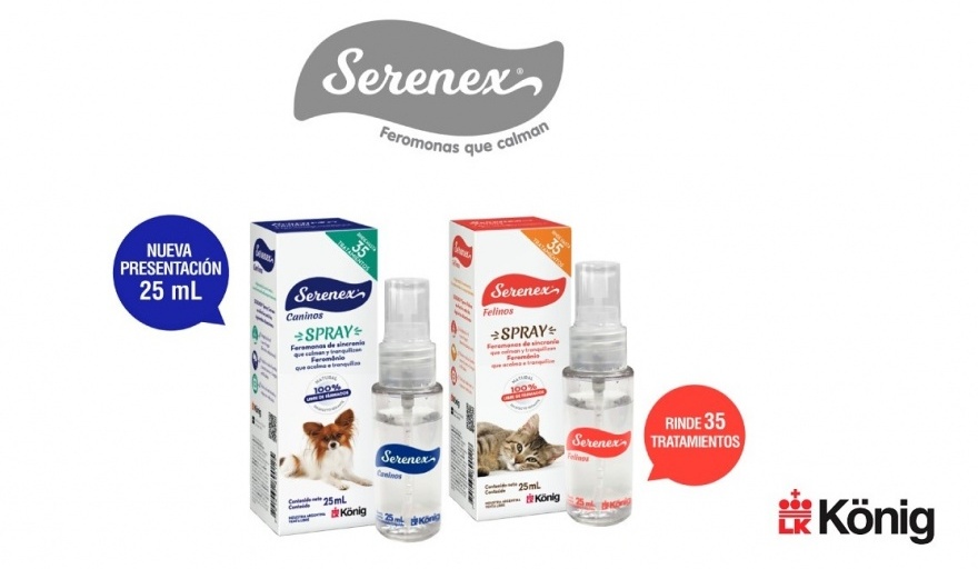 Sus dos líneas, Serenex® Caninos y Serenex® Felinos se comercializan en dos versiones: difusor + repuesto para un uso continuo ante situaciones de estrés como mudanzas, convivencia entre animales, ingreso de nuevos miembros al hogar, etc., y en spray de 70 ml para un uso más ocasional como visitas a la veterinaria, miedo a ruidos fuertes, etc., que rinde hasta 100 tratamientos.