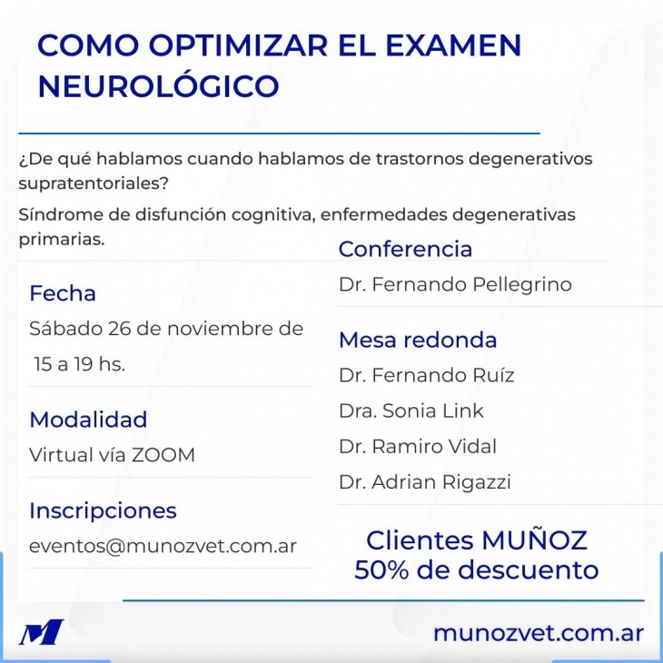 Se realizará con la modalidad virtual vía zoom. Organizan: Neuro Vet y Muñoz Vet.