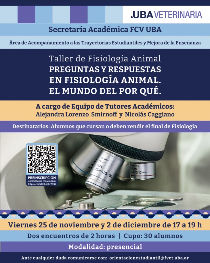 Son dos encuentros de dos horas. Modalidad presencial. Destinado a alumnos que cursan o deben rendir el final de Fisiología en la FDV de la UBA.