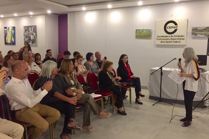 "Estamos llevando a cabo hoy, en la sede del Consejo Profesional de Médicos Veterinarios, el cierre de varias actividades de cultura, que consiste en una muestra itinerante que consta de veinte cuadros que han participado y ganado premios en el Concurso de Artes Plásticas que se realizó a mitad de año y que a partir de ese momento ha circulado por los distintos Colegios y Consejos integrantes de la CEPUC, por eso decimos que es una muestra itinerante", señala la Dra. Susana Santorsola (Contadora Pública), presidente de la Comisión de Cultura de la CEPUC.
