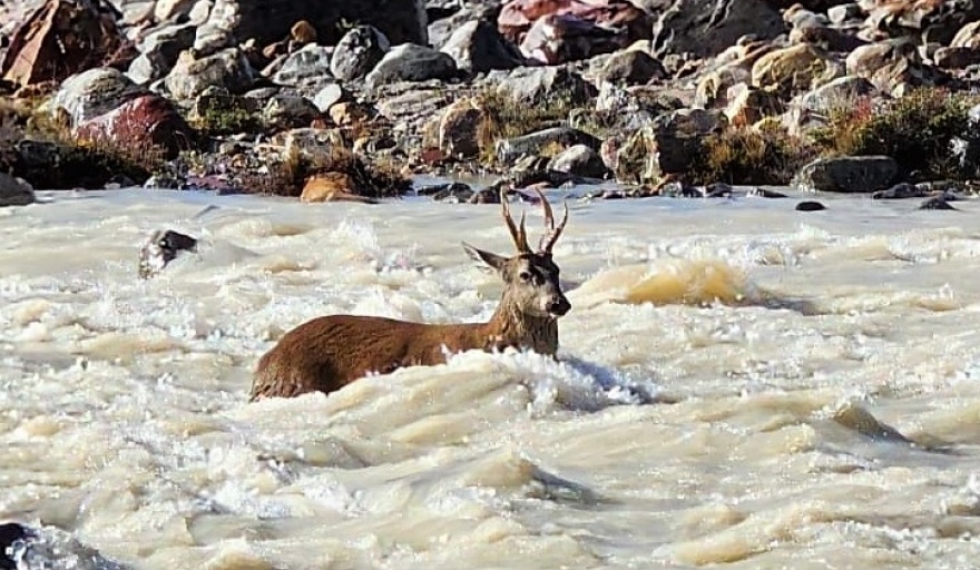 El turista logró registrar en video cómo el ejemplar de este ciervo nativo en peligro de extinción debió ingresar al río ante la persecución de los perros.