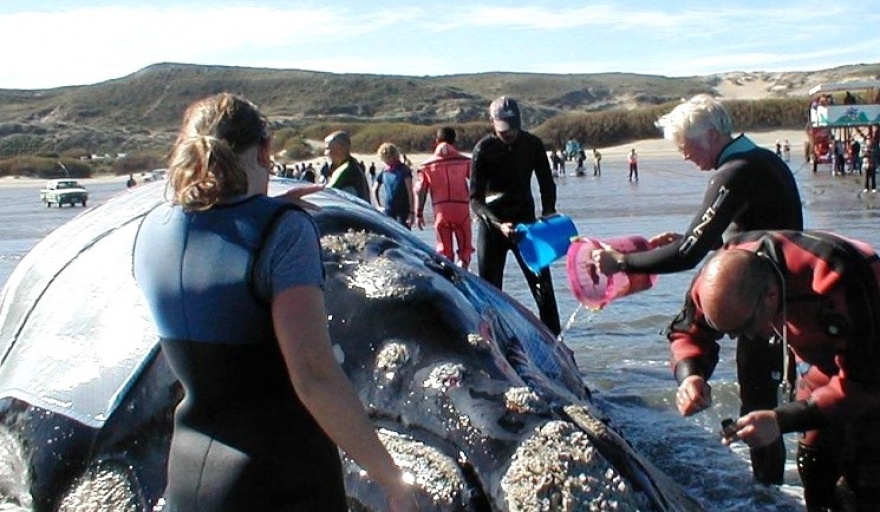 Los guías balleneros y buzos locales fueron los primeros que intentaron desenredarlo. Sin embargo, la imposibilidad de acceder a las cadenas bajo el agua, los llevó a tomar la decisión de vararla intencionalmente para cortar las cadenas en la playa, desafiando los peligros que representaba esta maniobra que sólo debe realizarse por especialistas entrenados.
