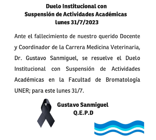 El 30 de julio de 2023 falleció el médico veterinario, docente y coordinador de la Carrera de Medicina Veterinaria de la Facultad de Bromatología de la Universidad Nacional de Entre Ríos, Dr. Gustavo Sanmiguel.