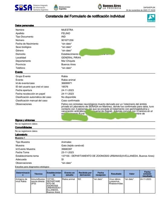 El Médico Veterinario Mateo Escudero, de la mencionada localidad difundió en redes el análisis positivo y alertó; “Ante el reciente diagnóstico de Rabia positiva en un gato, me veo en la obligación profesional de comunicar de forma masiva a mis contactos! Cómo lo repito en el consultorio, hay formas de vacunar privadas como estatales y gratuitas! Prevenir siempre es más fácil que curar”, concluyó.