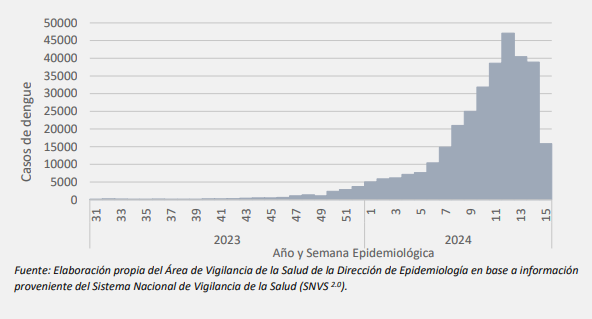 En términos acumulados se han notificado desde la SE 31/2023 hasta la SE 15/2024 333.084 casos de dengue (91% autóctonos, 7% en investigación y 2% importados), de los cuales 315.942 corresponden al 2024. La incidencia acumulada hasta el momento para la temporada es de 708 casos por cada cien mil habitantes.