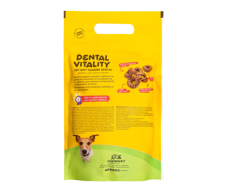 Chemovet presenta DENTAL VITALITY, su nueva línea de chews/snacks dentales “premium” desarrollados para promover la higiene bucal completa de los perros, controlando la formación de placa y sarro, manteneniendo encías sanas y reduciendo al mínimo los riesgos de fracturas, atragantamiento o digestión inadecuada.