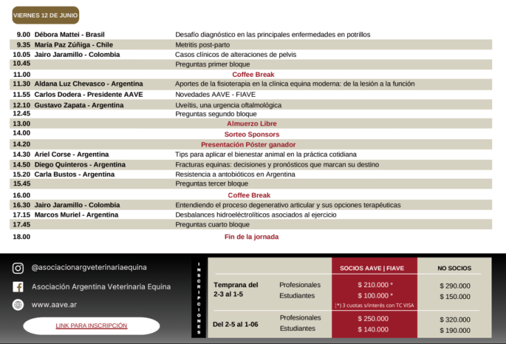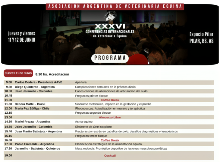 La Asociación Argentina de Veterinaria Equina (AAVE) realiza este evento internacional en los salones de Espacio Pilar, en la localidad de Pilar, provincia de Buenos Aires.